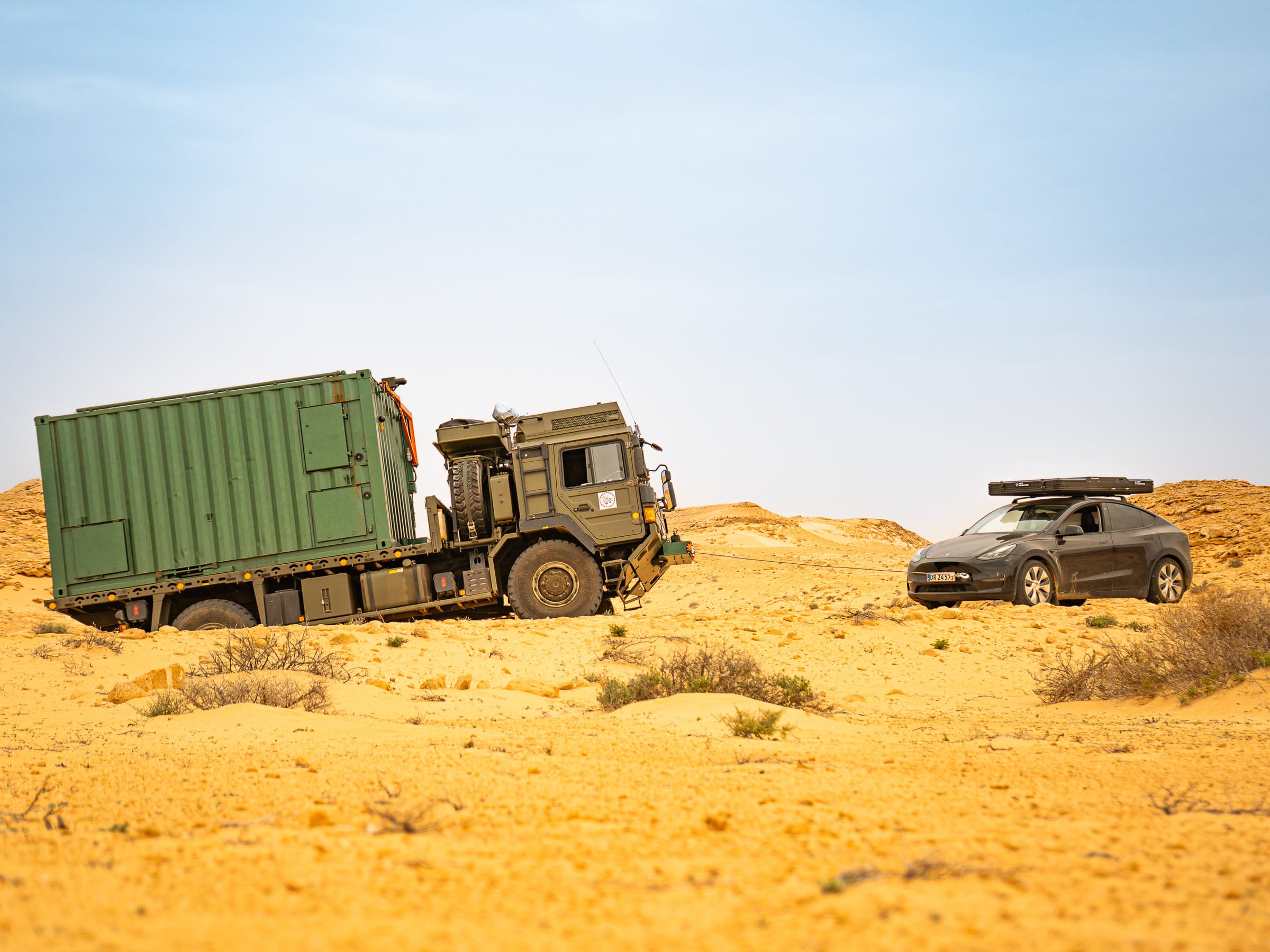 Private military truck pulled free in the Sahara sand
