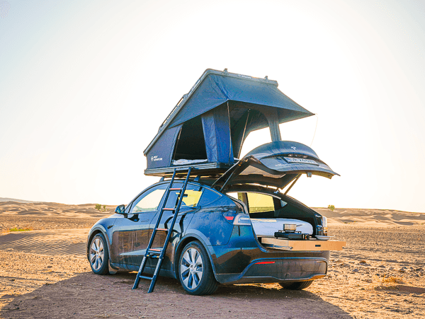 Our camper kit makes it possible for two people to sleep comfortably inside the car. It has an integrated kitchen that can be pulled out of the trunk, complete with a refrigerator and gas stove. Together with the roof tent on the roof, it provides a total of four beds – and in a few minutes, the car can be transformed into a small camper.