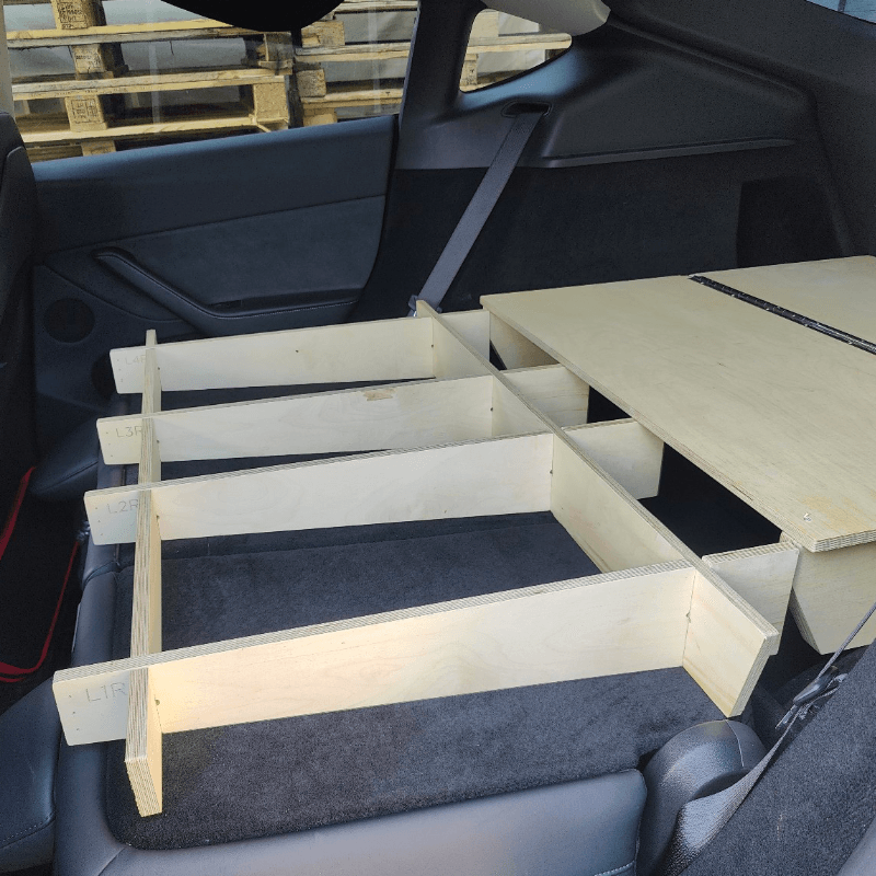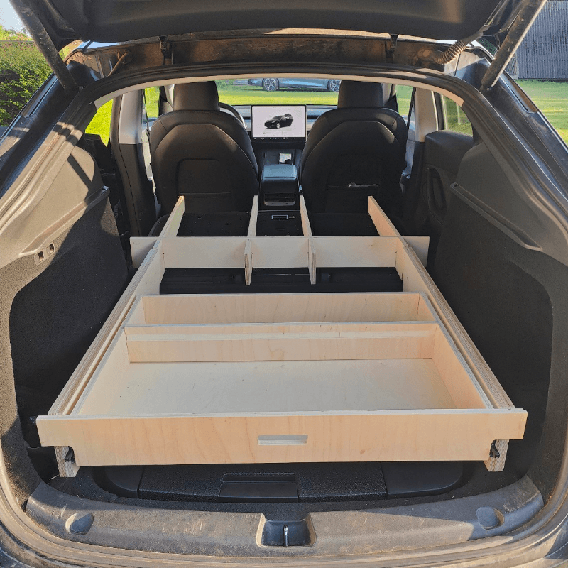 Under køkkenet er det muligt at placere det store 35 liters Tesla Model Y køleskab (sælges separat).